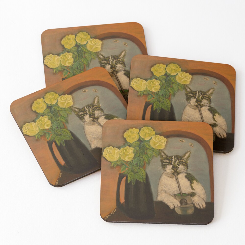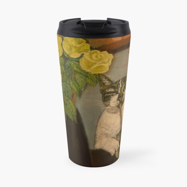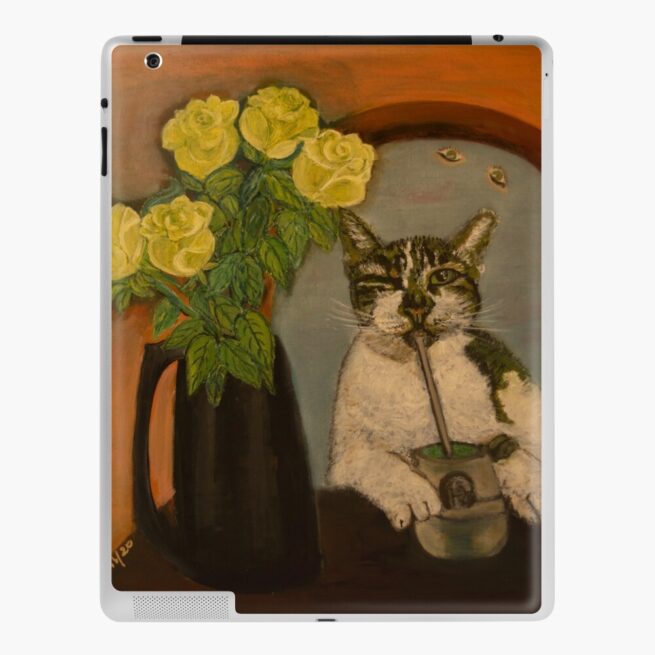 Sanda imagines that her cat has her own little house with beautiful yellow roses on a table. Cat Rogue knows that Sanda loves to have Mate every morning. One day Rogue decided to try Sanda’s Mate so that she takes the tea pot that Sanda has just prepared and hides herself in her little house. She starts sipping the Mate while winking her eye to her friends like saying: “I know that Sanda is desperately looking for her Mate ….she cant imagine that I have it…and that am enjoying seeing her desperately looking for it.