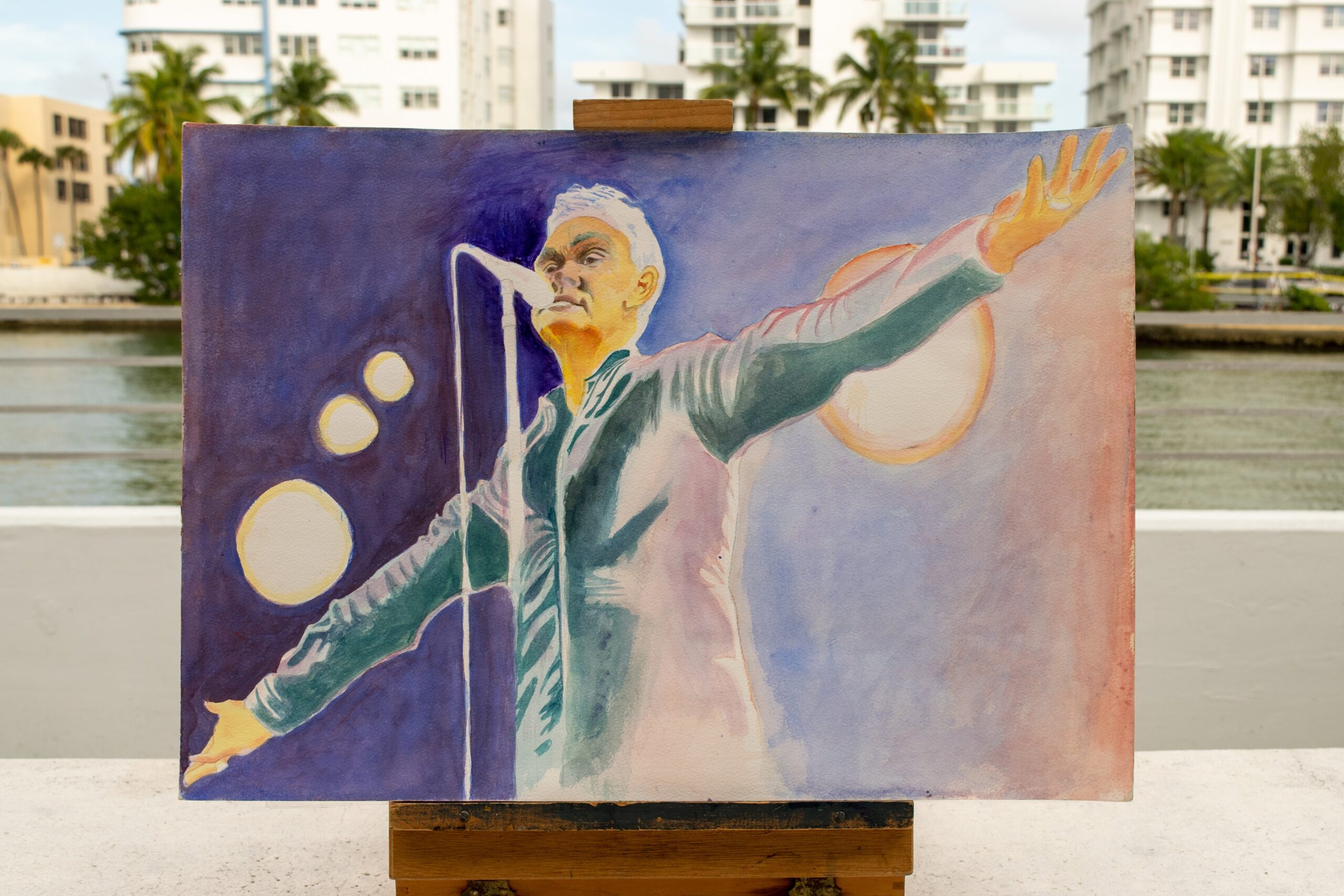 Morrisey British Pop icon Watercolour on Paper 16″ x 23″ 2013 Purple Blue Pink Yellow Navy Brown White Orange Green Celebrity Portrait Autobiography by Morrisey Penguin Classics.